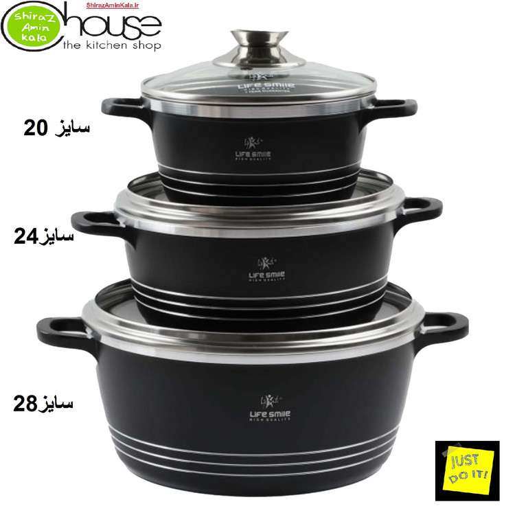 دارای سه عدد قابلمه چدنی در اندازه های۲۸-۲۴-۲۰ با طرح کلاسیک و درب شیشه ای بسیار بادوام و دسته های نسوز می باشد