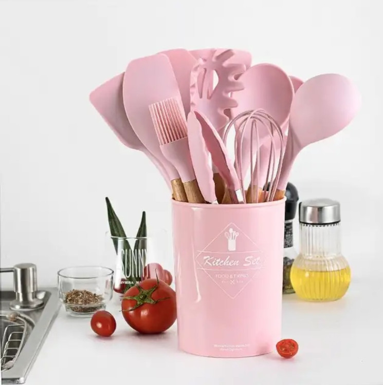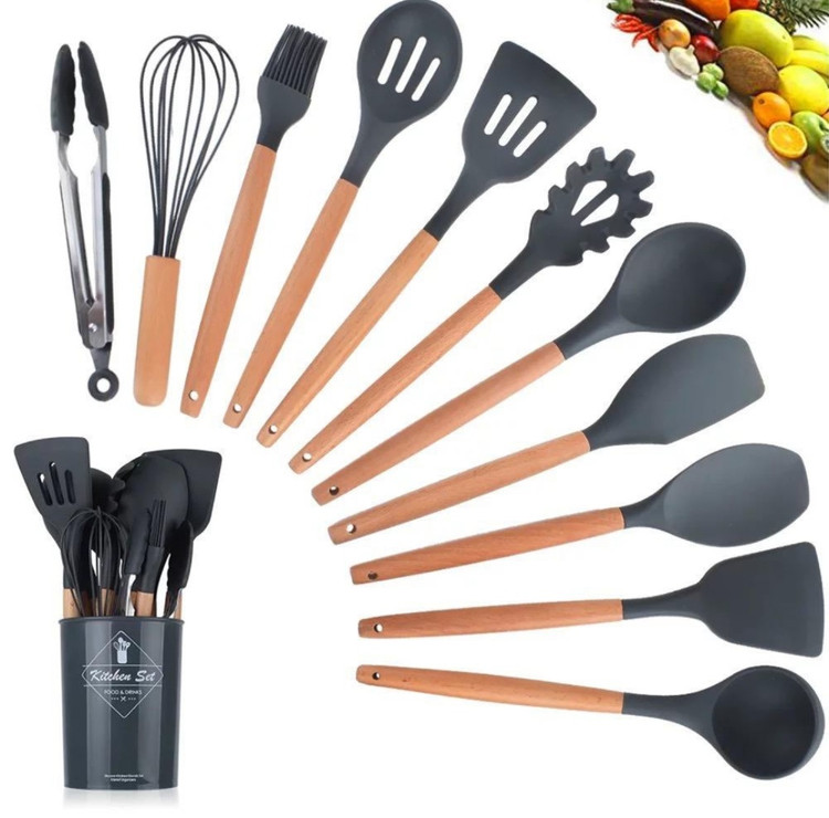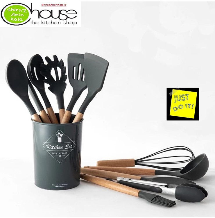 سرویس کفگیر و ملاقه سیلیکونی 12 پارچه دسته چوبی Kitchenware Set