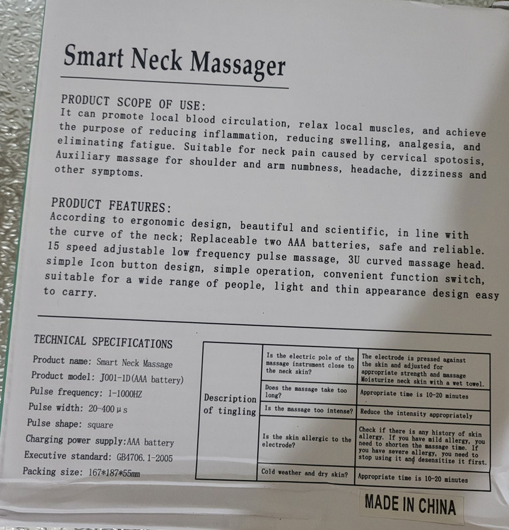 ماساژور گردن هوشمند دارای 2 عددالکترود پالس جهت ماساژ تمامی نقاط بدن است . قابلیت تنظیم نوع ماساژ در 12 حالت مختلف را دارامی باشد.
