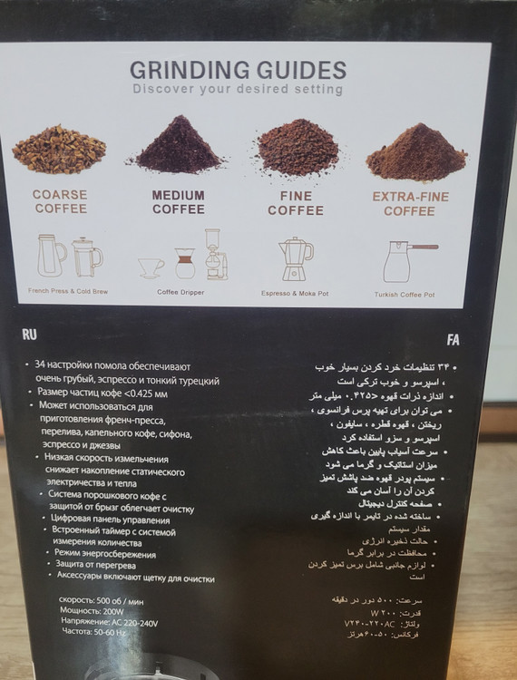 سرعت ۵۰۰ دور در دقیقه / تنظیم آسیاب جهت اسپرسو، قهوه ترک و قهوه فرانسه / محافظت در برابر حرارت / دارای سوراخ مخروطی استیل ضد زنگ ۴۰ میلی متری / دارای 34 درجه تنظیم آسیاب از اسپرسو تا ترک / قابل استفاده برای آسیاب دستگاه های فرنچ پرس و سایفون, اسپرسوساز و موکاپات / دارای سرعت آسیاب متوسط که باعث کاهش گرما و میزان استاتیک می شود / دارای صفحه کاربری دیجیتال / دارای تایمر اندازه گیری / دارای سیستم ذخیره سازی انرژی