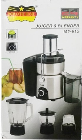 شرکت رمانتیک هوم یکی از تولید کنندگان بنام ومشهور در حوزه لوازم خانه و آشپزخانه است. این شرکت در تولید انوع لوازم خانگی سابقه درخشانی دارد وبه دلیل کیفیت بسیار بالا ، طراحی های متنوع ،نوآوری ،استفاده از مواد با کیفیت، قیمت مناسب و خدمات پس از فروش این شرکت از استقبال زیادی بین مردم برخوردار است.وجود دستگاه آبمیوه گیری در آشپزخانه علاوه بر این که تنوع نوشیدنی های را که مصرف می کنیم بیشتر می کند می تواند ما را به خوردن مواد غذایی سالم عادت دهد . آبمیوه گیری چهار کاره رمانتیک هوم مدل MY-615 یکی از محصولات کاربردی این برند است که عملکرد متفاوتی دارد این دستگاه چهار کاره است که علاوه بر عمل آبمیوه گیری دارای یک پارچ مخلوط کن به ظرفیت 1.6لیتراست همچنین یک ظرف آسیاب و یک خرد کن به همراه این مدل به مشتری ارائه می شود. بدنه از جنس استیل و مقاوم در برابر زنگ زدگی است. موتور800 وات دستگاه قابلیت کار کردن در 2 سرعت را دارد و از توان آب میوه گیری فوق العاده ای برخوردار است بر روی این بدنه پیچ ولوم تعبیه شده است که تنظیمات دستگاه از طریق آن انجام می شود. از دیگر ویژگی های این دستگاه دهانه ورودی عریض آن است که به راحتی میوه های کامل مثل یک سیب کامل به قطر 75mm در خود جای می دهد پس از قرار گرفتن میوه در دهانه با استفاده از فشاری همراه دستگاه می توان میوه را به داخل دهانه هدایت کرد.مخزن تفاله برای این دستگاه در نظر گرفته شده که قادر به ذخیره سازی تفاله است .این مدل به گونه ای طراحی شده که از لغزش دستگاه در هنگام کار جلوگیری می کند و جنس بدنه و تیغه آبمیوه گیر استیل ضد زنگ است که در اثر استفاده و به مرور زمان زنگ نزده و فرسوده نمی شود. وجود سیستم ضد چکه از کثیف شدن فضای اطراف جلوگیری می کند همچنین سیستم ایمنی این دستگاه از بالا رفتن حرارت به دلیل استفاده طولانی مدت جلوگیری می کند. اجزا قابل جدا شدن و قابل شستشو می باشند.