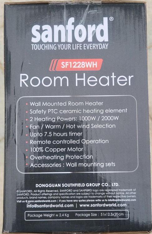 برند سانفورد با دارا بودن بیش از 1000 کالا در زمینه لوازم خانگی یکی از برند های معتبر در آسیا و اروپا محسوب می شود . فن هیتر دیواری طرح اسپلیت سانفورد مدل SF1228WH یکی از دستگاههای بسیار مناسب برای تامین گرمایش در منزل و محل کار و یا هر مکان دیگر است. دلایل این برتری را در زیر می آوریم . این فن هیتر قابلیت تنظیم اتوماتیک حرارت را در دمایی که توسط کاربر تعیین شده و بر روی پنل دستگاه هم نشان داده می شود ، را دارد همچنین در دو توان 1000 و 2000 وات قابل تنظیم می توان آن را قرار داد.تایمر 7.5 ساعته دستگاه امکان بسیار خوبی برای کاربر می باشد تا بعد از ساعت معینی دستگاه را بطور خودکار خاموش کند. نصب دستگاه بسیار اسان بوده و بر روی دیوار چوبی و یا هر دیوار دیگری با دو پیچ قابل نصب است . با ریموت کنترل می توان تنظیمات دستگاه را انجام داده و آن را کنترل کرد .سیستم حفاظتی قطع اتوماjتیک در اثر افزایش دما نیز از امکانات ایمنی آن می باشد .بعد از خاموش کردن هیتر ، فن دستگاه ( بدون گرمایش )به مدت 30 ثانیه کار می کند تا حرارت مانده در قطعه گرم کننده را از دستگاه خارج کند . دقت شود که با تنظیم دما توسط ریموت کنترل و یا از روی پنل دمای نشان داده شده همان دمای تنطیم شده می باشد اما بعد از 3 ثانیه دمای محیط نشان داده می شود و این فقط برای نمایش دما است و دمای تنظیم شده همان است که در لحظه تنظیم مشاهده شده است. همچنین دقت شود با توجه به قرار گرفتن این دستگاه بر روی دیوار و ارتفاع بیش از یک و نیم متر و یا هر مقدار دیگر ، دمای تنظیم باید بالاتر باشد از دمایی که تمایل دارید در پایین اتاق و یا هر مکان بسته دیگر داشته باشید چون هوای گرم سبک تر است و قسمت بالاتر اتاق همیشه گرم تر خواهد بود . این مقدار را باید با توجه به ارتفاع قرار داده شده و محل قرار گیری با تجربه بدست بیاورید بعنوان مثال وقتی دستگاه را در ارتفاع 2 متر از کف اتاق نصب می کنید برای اینکه ارتفاع نیم متری از کف اتاق دمای 25 درجه داشته باشد باید تنظیم را روی 32 یا 33 قرار بدهید و یا کمی بالاتر و یا پایین تر ، که این مقادیر با تجربه بدست می آید .