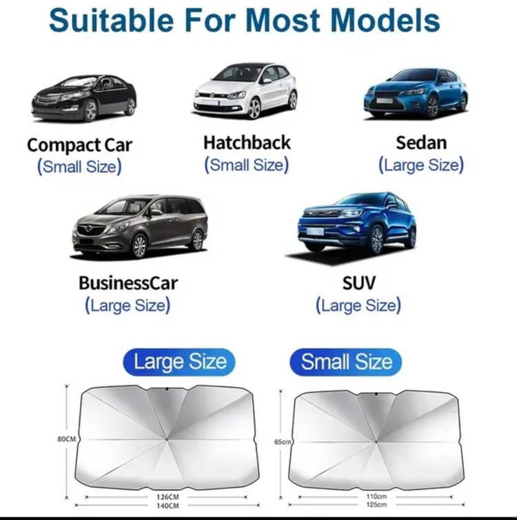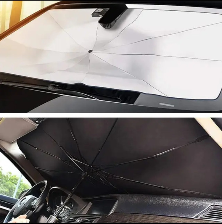 این محصول برای هر گونه محافظت در برابر نور خورشید عالی است.طراحی شده با پارچه محافظ UV طراحی هوشمندانه این چتر (sun shade umbrella) نگران افتادن آفتاب گیر از شیشه جلو خود نباشید و آفتابگیر شیشه جلو چتری دارای ده دنده فولادی است که به خوبی پشتیبانی و از سقوط جلوگیری می کند.طراحی تلسکوپی آفتاب گیر، باعث شده این محصول استفادهای آسان داشته باشد و باز و بسته کردن آن سریع و بدون زحمت باشد.طراحی فوقالعادهای ک با پوشش ضد آفتاب روکش نقره به شدت نور خورشید را منعکس می کند و دمای داخل خودرو را کاهش می دهد و از خودروی شما محافظت می کند.سایبان ضد آفتاب ابزاری کاربردی برای محافظت از داخل خودرو در برابر نور UV و کمک به کاهش دمای داخل ماشین است.