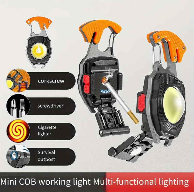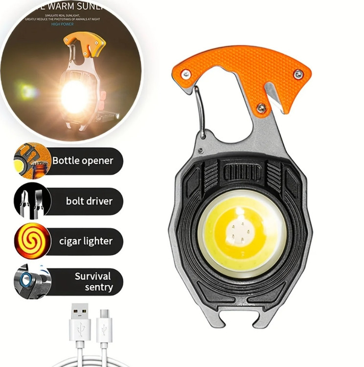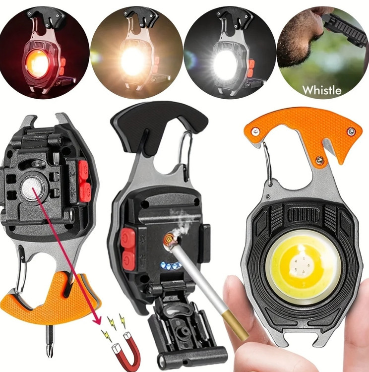 چراغ قوه چند کاره کمپینگ مدل W5147 یک محصول کوچک و جمع و جور است که به راحتی در جیب جا می شود. در سفر، کمپینگ، محل کار، هنگام تعمیرات، در محیطهای باز و هر جایی که نیازمند روشنایی باشید این چراغ قوه مفید خواهد بود. از چراغ قوه چند کاره می توانید به عنوان جاسوئیچی استفاده کرده و یا آن را به کیفتان وصل کنید. با فشردن دکمه خاموش و روشن آن برای مرتبه اول نور مهتابی با شدت زیاد، مرتبه دوم نور مهتابی با شدت کم، در مرتبه سوم نور آفتابی با شدت زیاد، در مرتبه چهارم نور آفتابی با شدت کم، در مرتبه پنجم نور قرمز و در مرتبه ششم نور قرمز چشمک زن دریافت خواهید کرد. و در نهایت با فشردن کلید برای بار هفتم چراغ قوه خاموش خواهد شد. جنس آلیاژ بدنه چراغ قوه چند کاره آلومینیوم است که در برابر ضربه مقاوم است. برای شارژ آن کافی است از کابل شارژ type C که به همراه چراغ قوه قرار دارد، استفاده کنید. پشت این چراغ قوه یک فندک تعبیه شده است که با فشردن دکمه مربوط به فندک و نگه داشتن دکمه، فندک شروع به قرمز شدن می کند و با برداشتن دست از روی دکمه فندک خاموش می شود. این چراغ قوه چند کاره دارای سوت نجات و همچنین تیغ که در مواقع اضطراری می توان از آن استفاده کرد. این چراغ قوه 2 عدد پیچ گوشتی نیز دارد. که می توان سری پیچ گوشتی مورد نظر را در سوراخ بالای چراغ قوه قرار داد و استفاده کرد. پشت چراغ قوه یک آهنربا وجود دارد که موقع کار می توان به سطوح فلزی متصل کرد.دارای اقلام : - فندک - آهن ربا - تیغ - 2 عدد پیچ گوشتی - نور مهتابی، آفتابی و قرمز - درب بازکن - دارای سوت می باشد.